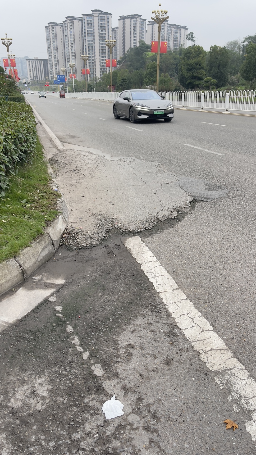 广安区的路政部门请进 火山大道和曙光路交界的路口处,最右边车道路面这里一直有一块凸起,对右转车非常不友好,容易引发车辆侧翻,请相关部门解决一下。