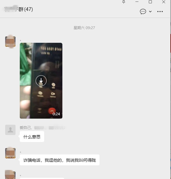 上周星期六,在一个熟识的人的小群,一位朋友不知为啥个人隐私电话等信息泄露,经常接到各类电诈等骚扰信息,不胜其烦,也骂过,都无效。这天其又接到电诈电话,趁着无事,就想着电诈可恶,戏弄一番。然后将戏弄的视频发在小群里,大家看了哈哈大笑,拍手叫好,感觉大快人心。
