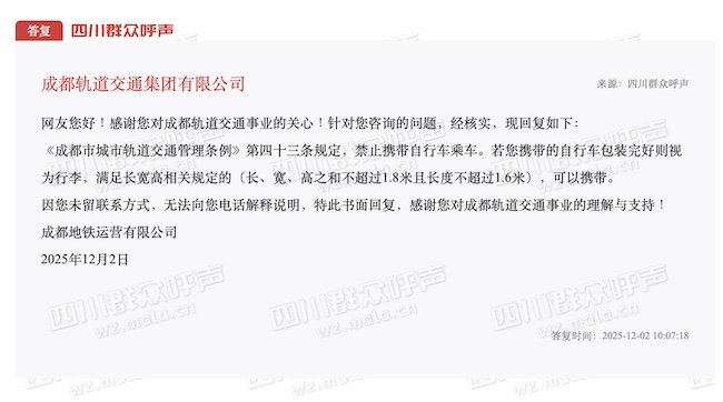 骑友能带自行车上地铁吗?成都地铁:包装合规即可